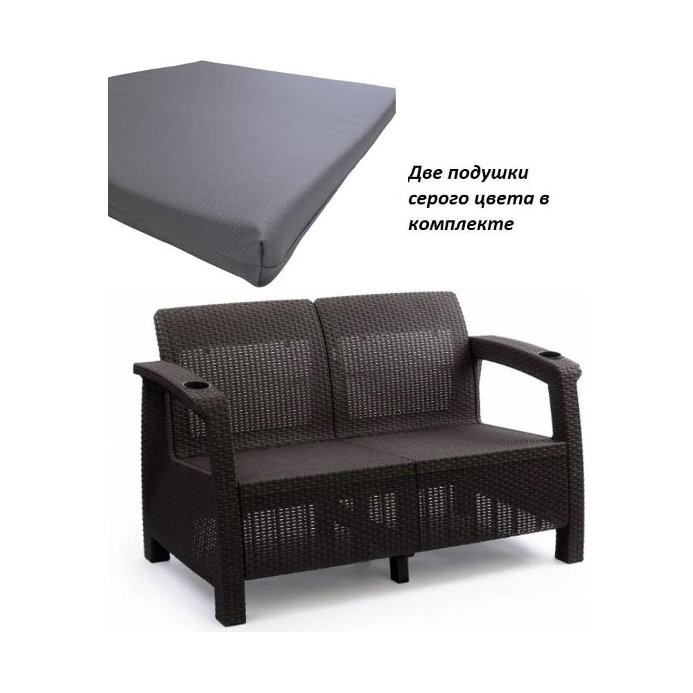 Двухместный диван произведен из высококачественного полипропилена, имитирующего плетение из ротанга. Имеет два посадочных места, допустимая нагрузка на одно посадочное место - 106 кг (212 кг). На подлокотниках дивана расположены отверстия для напитков. Диван может стать идеальным решением по оформлению зоны отдыха; в доме, на садовом участке, в офисном помещении или в кафе. Благодаря цветовым решениям, диван подойдет под любой интерьер. Диван упаковывается в индивидуальную упаковку, инструкция по сборке прилагается. Зону отдыха также можно дополнить журнальным столиком и креслами серии «Ротанг». Подушки для дивана черного цвета входят в комплект, изготовлены из прочного и водоотталкивающего материала Оксфорд 600.
