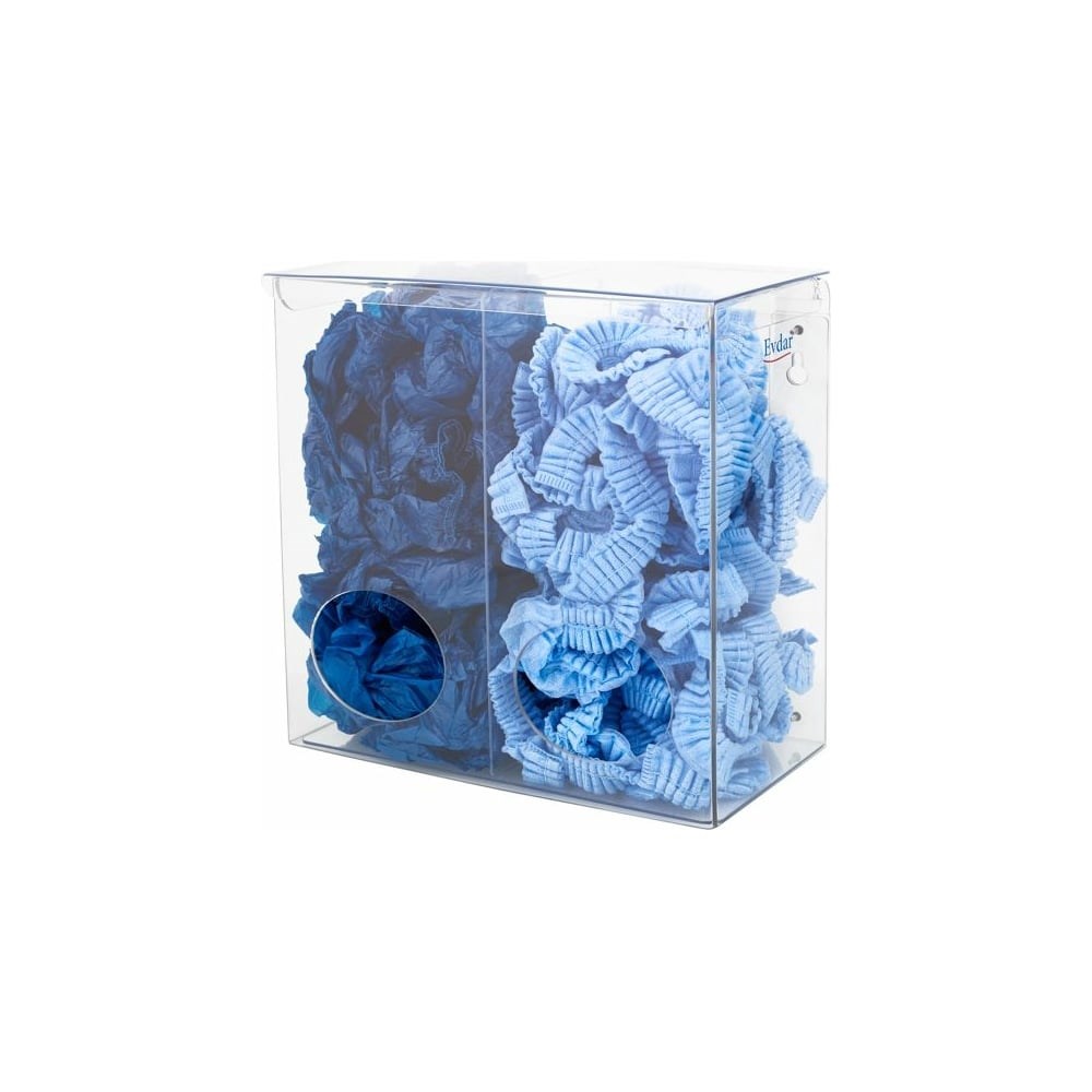 Диспенсер для одноразовых СИЗ Evdar двухсекционный D2020 изготовлен из ударопрочного прозрачного пластика - поликарбоната.  В отличие от оргстекла: устойчив к любым спиртосодержащим дезинфицирующим жидкостям и  со временем не трескается и не становится мутным. по мере эксплуатации наэлектризовывается.