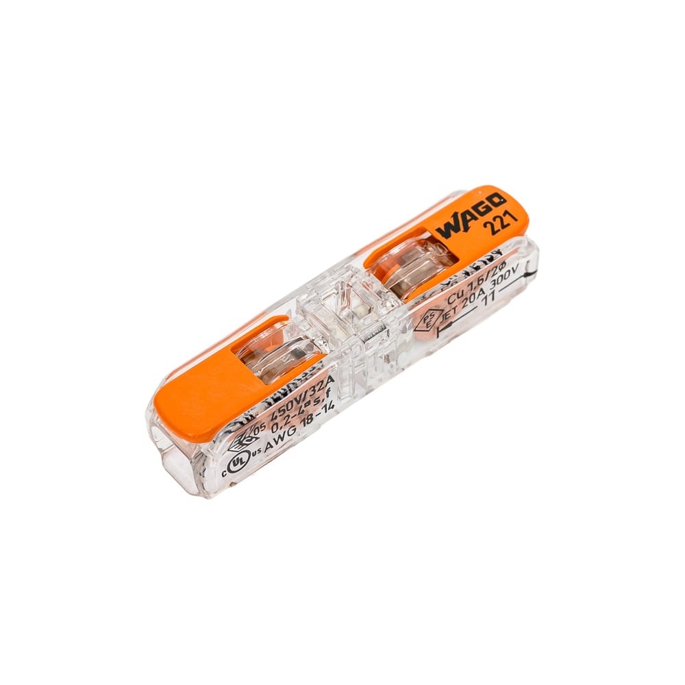 Соединительные клеммы WAGO 221 с зажимом захватывает до 5 зачищенных тонкопроволочных проводников от 0,08 мм2 до 4 мм2, одножильные и многожильные до 2,5 мм2. Для соединения алюминия, необходимо использовать токопроводящую пасту. С помощью клемм подсоединяют проводники для подключения светильников, люстр, жалюзи, ставней, дверных приводов и т.д. Поднять оранжевый рычажок перпендикулярно клеммнику, тем самым открывается вводное отверстие клеммы. Ввести проводник со снятой изоляцией, примерно на 10 мм, во входное отверстие клеммы и опустить рычажок в исходное положение. Самопроизвольное отсоединения таким образом становится невозможным. Номинальный ток - 32А для 4 мм² / 24А для 2,5 мм².