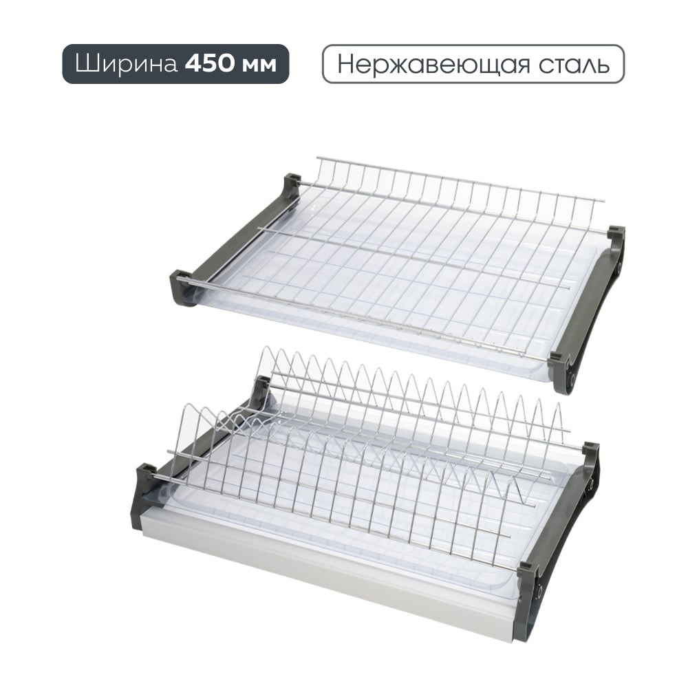 Двухуровневая встраиваемая сушилка для посуды. Предназначена для монтажа в верхний шкафчик кухонного гарнитура. В комплект входят: держатель тарелок и полка для сушки чашек и бокалов ИЗ НЕРЖАВЕЮЩЕЙ СТАЛИ, два поддона-накопителя для стекающей воды, крепежные элементы и два алюминиевых профиля, позволяющих осуществлять монтаж изделия в шкафчики без дна, сохраняя жесткость конструкции. Допустимая нагрузка на каждый уровень до 12 кг.