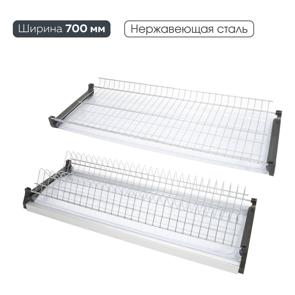 Классическая двухъярусная сушилка для тарелок и кружек с двумя полками выполнена в современном дизайне. Предназначена для монтажа в верхний шкаф кухонного гарнитура. Состоит из двух независимых уровней. Нижний идеально подходит для сушки и хранения тарелок, верхний – для кружек, чашек и бокалов. Решетчатая конструкция сушки не дает застаиваться влаге. Для каждого яруса предусмотрен собственный поддон, куда стекают остатки воды с вымытой посуды. Его легко извлечь, чтобы очистить от капель во время уборки. И так же просто установить обратно. Сушилка универсальная, не имеет ограничителей размеров. Вы сможете размещать в ней тарелки разных размеров в порядке, удобном именно Вам. Оба яруса изготовлены из нержавеющей стали, устойчивой к влаге и не подверженной коррозии. Двухуровневая сушка прочная и выдерживает нагрузку до 12 кг на каждый ярус. Универсальный хром прекрасно вписывается в любые интерьеры. Преимуществом модели является наличие алюминиевой рамки. Она обеспечивает жесткость конструкции и позволяет установить сушку в шкаф без дна, что повышает вентиляционные возможности шкафа. Изделие монтируется в кухонный шкаф с фасадом 700 мм, монтаж осуществляется в течение нескольких минут.