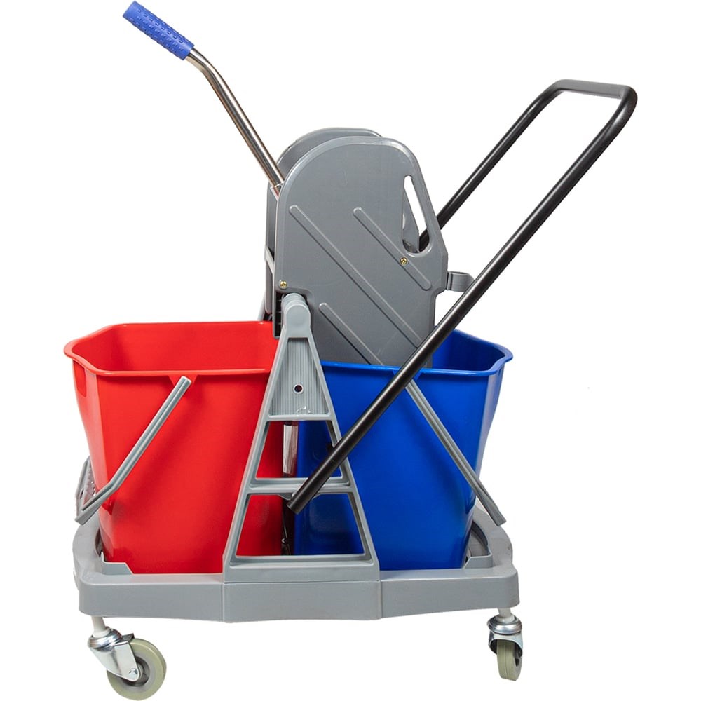 Тележка уборочная двухведерная предназначена для проведения влажной уборки на больших территориях, в офисах, складах, магазина и в производственных помещениях. Состоит из пластиковой платформы на колесах с двумя ведрами объемом по 17 л и механического отжима для мопов. Корпус тележки платформы изготовлен из ударопрочного ABS-материала. Тележка для уборки выполнена в двухцветном исполнении синее/красное. Колеса у тележки имеют высокую проходимость, и перемещение по любой территории. Перекидная ручка у двухведерной тележки позволяет оперативно изменить траекторию движения. Механический отжим с металлической ручкой подтверждает надежность механизма и продлевает эксплуатацию тележки.