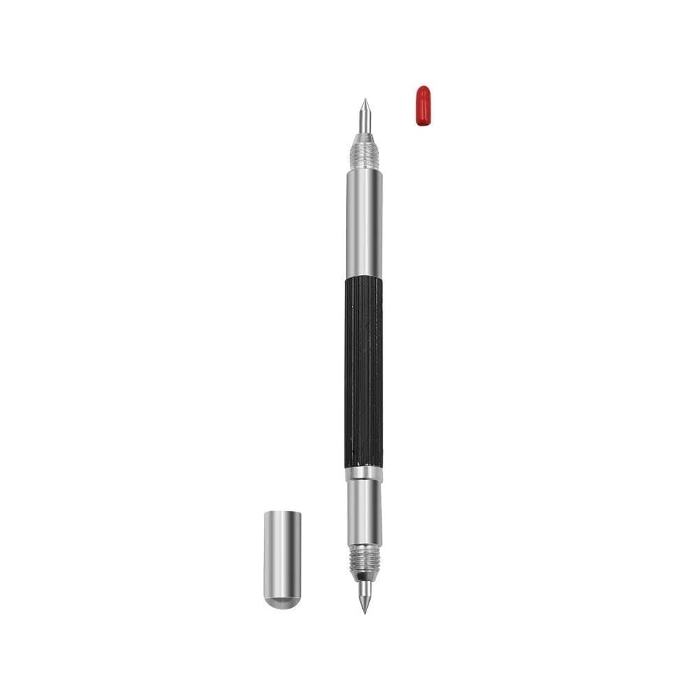 Прочная двусторонняя ручка для гравировки и разметки с двумя острыми наконечниками из карбида вольфрамовой стали. Твердосплавная ручка - это идеальный инструмент для создания острых точных линий на закаленных материалах, таких как закаленная сталь, нержавеющая сталь, камень, керамика и стекло. Легкая и прочная конструкция ручки выполнена из алюминия и твердого пластика. Длина 14см, диаметр 0,8см.
