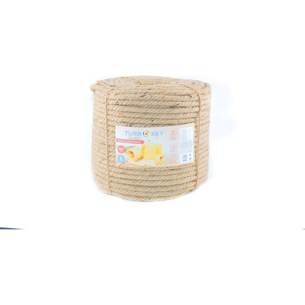 Джутовый канат Turbosky 8 мм, 100 м 1291_a изготовлен из натурального волокна джута. Благодаря высокому качеству материал не ворсится и не тянется. Канат имеет максимальную прочность и долговечность. У изделия высокое значение сопротивления на разрыв. Канат не подвергается процессам гниения и является стойким к сильным перепадам влажности и температуры. Незаменим для использования в доме и дачном хозяйстве. Является универсальным материалом для рукоделия, декорирования помещений, отделки интерьера, ремонте, при пошиве сумок, шторных композиций.