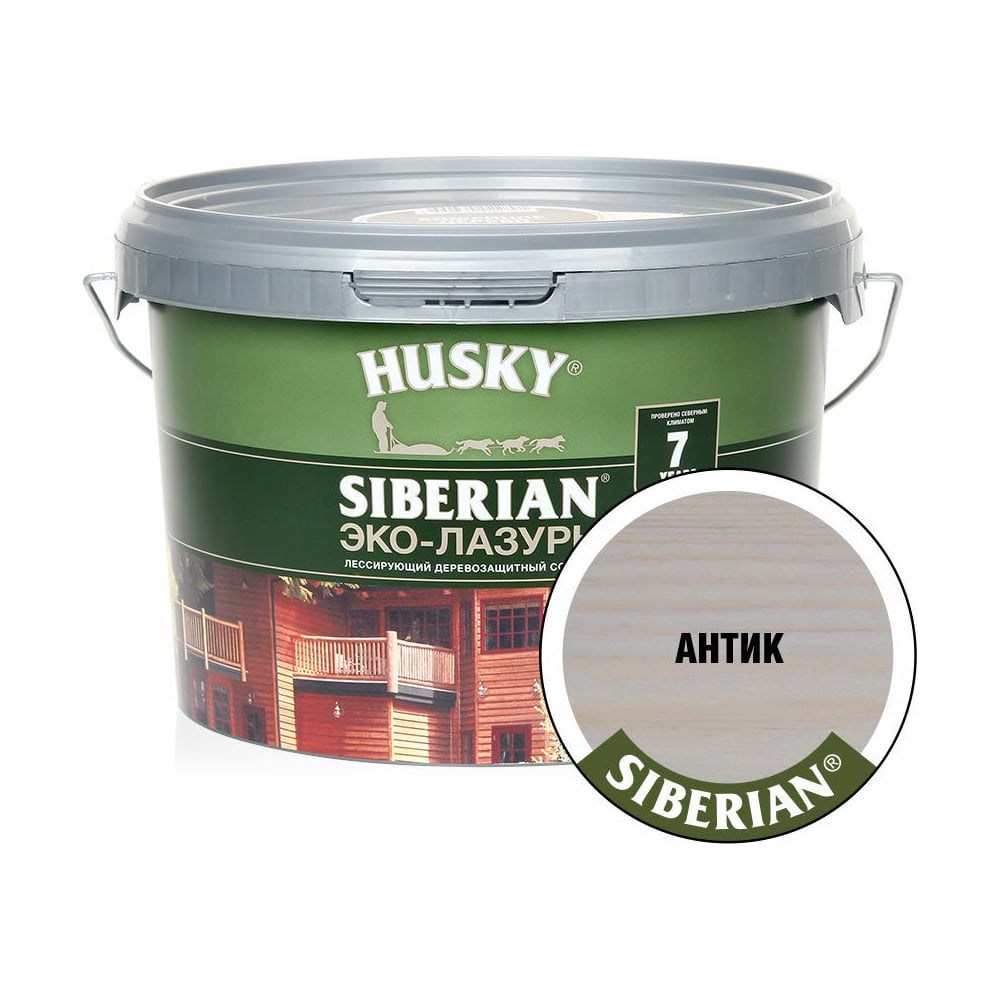 Эко-лазурь HUSKY антик 2,5 л 25190 - экологически безопасный лессирующий 100% акриловый антисептик для долговечной защиты древесины (до 7 лет). Наносится на бревенчатые и обшитые отделочной доской фасады, окна, перила, ограды, двери, садовую мебель, стены и потолки внутри помещений. Не содержит растворителей и практически не пахнет.