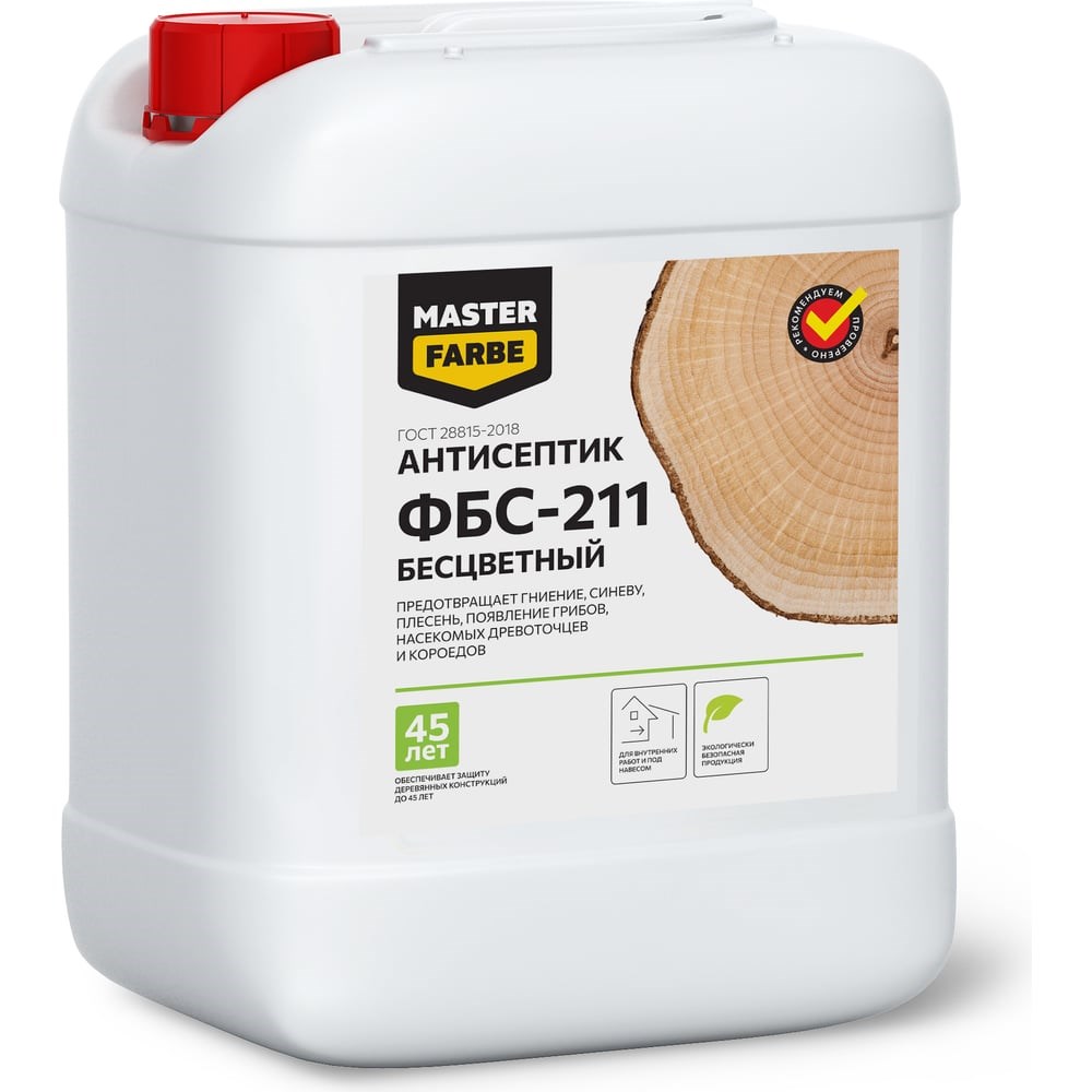 Экологичный антисептик для защиты древесины от синевы и плесени MASTERFARBE ФБС-211 (бесцветный; 10 кг) 4631159427347 предназначен для защиты деревянных строительных конструкций от биологического разрушения (грибов гниения, синевы, плесени, поражения насекомыми древоточцами) внутри и снаружи помещений под навесом. Антисептик идеален для защиты деревянных домов на период строительства, после высыхания безопасен для людей и животных.Преимущества:Обеспечивает защиту деревянных конструкций до 45 лет ГОСТ 20022.0-2016Не окрашивает древесину, может использоваться как антисептическая грунтовка под бесцветный и тонированный лакНе вызывает коррозию чёрных металловНе создает поверхностной пленки и не нарушает воздухообменСохраняет свойства и структуру древесиныНе имеет запахаЯвляется малоопасным веществом (IV класс опасности), не горюч и взрывобезопасен