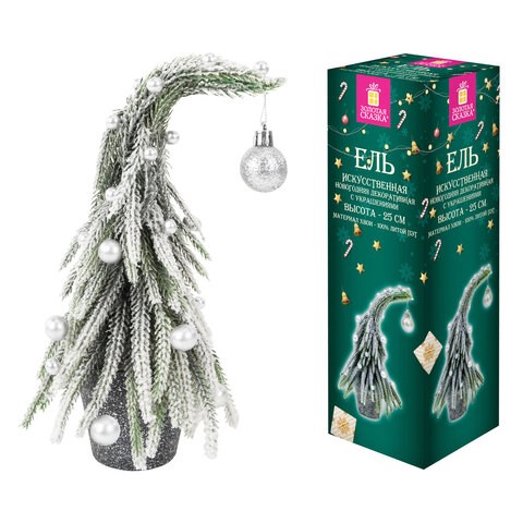 Материал – 100% литой ПЭТ. Цвет хвои – зелёный. Иголки украшены искусственным белым снегом и декоративными пенопластовыми шариками диаметром 1-1,5 см и пластиковым шаром диаметром 2,5 см. Ель имеет оригинальную форму, напоминающую шапочку гномика. Подставка выполнена в виде пластикового горшочка. Высота ели – 25 см.