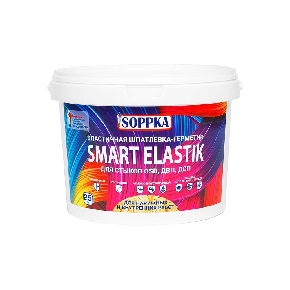 Эластичная шпатлевка-герметик для OSB SOPPKA SMART ELASTIK 2,5кг СОП-Шов2,5 для заполнения стыков и затирки швов OSB-плит, SIP, ДВП, ДСП, листов фанеры, межбревенных и межвенцовых стыков сруба. Позволяет создать единую поверхность. Благодаря эластичности не растрескивается и выдерживает нагрузки по растяжению и сжатию в ходе эксплуатации. Предназначен для наружных и внутренних работ. Герметик предотвращает развитие грибка и плесени, а также защищает от проникновения влаги и холода. Наносится шпателем или с помощью специальной насадки. Используя эластичный герметик, можно приклеить плитку, кафель или другие декоративные элементы.РАСХОД: Зависит от толщины и ширины шва между плитами. При ширине стыка 3-5 мм расход на 1 (один) погонный метр шва составляет 100-150 г.Работы проводить при температуре не ниже +5ºС и относительной влажности воздуха не более 65%. Время высыхания при температуре 20ºС и относительной влажности 65% ‒ 10-12 часов. При более низких температурах время высыхания увеличивается. Дальнейшие работы следует производить не ранее, чем через 7 суток после нанесения SOPPKA SMART ELASTIK.
