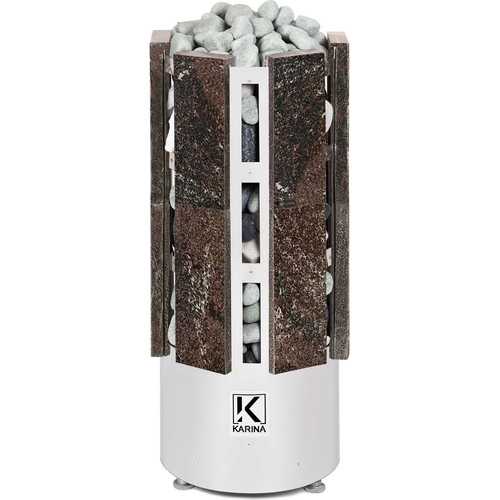 Электрокаменка Karina Forta 10 Амфиболит выполнена в напольном варианте и обладает цилиндрической формой дополненной плитами из натурального камня Амфиболита. Напряжение питания - 380В. Данная модель имеет 3 тэна, расположенных в виде треугольника. В центре внизу расположен бак для воды емкостью 3 л, который является парогенератором. Выше парогенератора имеется емкость под мелкие камни или нержавеющие шары объемом 2.5 л, вмещающая 5 кг мелкого камня, называемая закрытой каменкой с воронкой для подачи воды.Если в парогенератор не заливать воду, то каменка разогреет парную до высокой температуры (100 -120°C) с относительной влажностью воздуха 10-12% - режим сухой бани (финская сауна). Если залить воду в парогенератор, то при разогреве парной вода будет испаряться и увлажнять воздух до режима русской бани (60-70°C и 40-50% влажности). В обоих случаях возможно использование закрытой каменки, которая дополнительно прибавит мелкодисперного необжигающего пара.Управление электропечью осуществляется с помощью выносного пульта, который не входит в комплектацию и приобретается дополнительно. Благодаря выносному управлению каменку можно установить в различных местах парильного помещения, а при комбинации с фланцем можно встроить ее в полок.Все корпусные элементы печи выполнены из нержавеющей стали. Нагревательный элемент - ТЭН диаметром 10мм. Наружный кожух каменки дополнительно облицован плитами из Амфиболита толщиной 40мм, что придает ей еще большую теплоемкость.