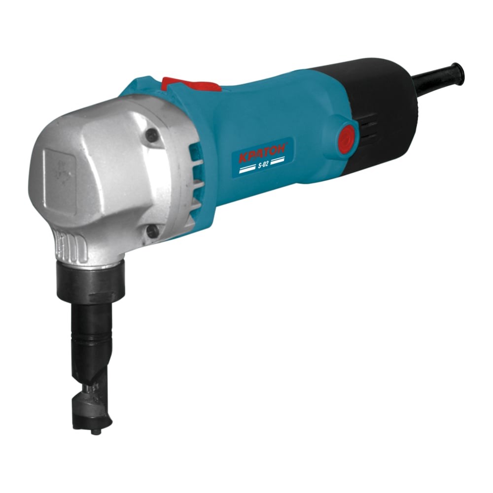 Универсальные электрические высечные ножницы Кратон S-02 3 13 01 002 для прямолинейной и криволинейной резки листовой стали толщиной до 1,6 мм и фасонного листового профиля различного поперечного сечения высотой не более 70 мм (волна, трапеция, прямоугольник и т.д.). Минимальный внутренний радиус разворота составляет 45 мм. Инструмент выполнен в виде миниатюрного вырубного пресса, который вручную перемещается по полотну по заданной разметке или шаблону. Матрица имеет круглую форму. Корпус редуктора изготовлен из прочного металла, что обеспечивает долгий срок службы инструмента. Благодаря компактным размерам и небольшому весу ножницами можно пользоваться даже в труднодоступных местах. Модель легкая имеет доступ к угольным щеткам для их быстрой замены.