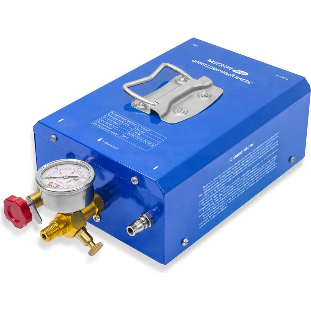 Опрессовочный насос электрический МЕГЕОН 98112 предназначен для опрессовки и проверки герметичности трубопроводов в системах водоснабжения и отопления. В изделии использован насос вибрационного типа с электроприводом для нагнетания высокого давления (12 кгс/см2), регулятор с редукционным клапаном, отградуированный в двух единицах измерения манометр для контроля выходного давления. Прибор укомплектован фильтром для грубой очистки от мелких частиц, всеми необходимыми для работы шлангами и складной ёмкостью для жидкости, имеет удобную ручку для переноски, небольшой вес и размеры. Инструмент рассчитан на питание от источника постоянного тока с напряжением 24 В, а также в комплект входит адаптер для подключения к электросети 230 В 50 Гц, потребляемая мощность составляет не более 150 Вт в зависимости от нагрузки.