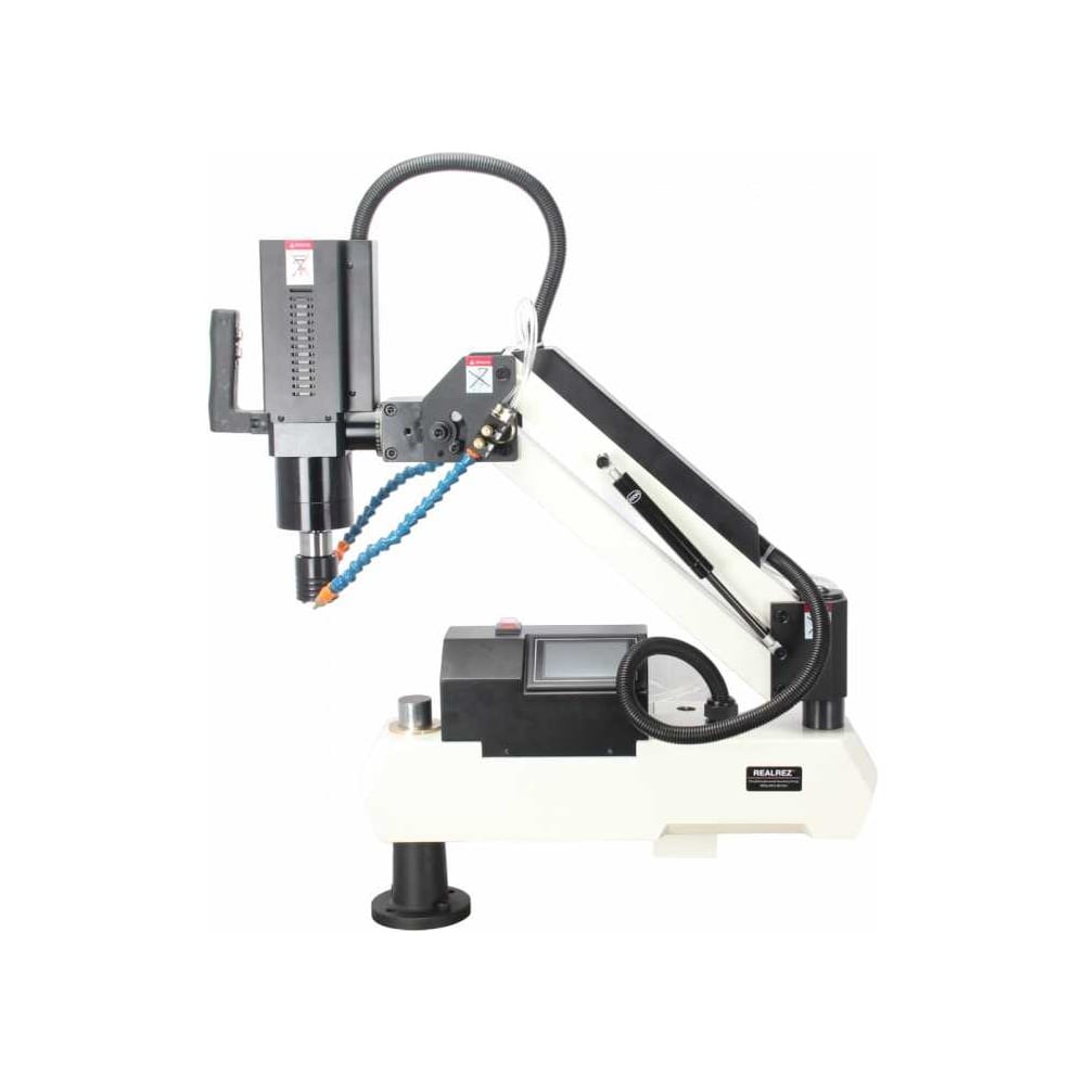 Резьбонарезной манипулятор М24SC предназначен для автоматического нарезания резьбы. Обладает высокой точностью обработки и отличным темпом работы. Способен нарезать резьбу в сквозных и глухих отверстиях заготовок из стали, чугуна, цветных сплавов и пластиков. Резьбонарезной манипулятор обеспечивает гибкость в решении производственных задач, позволяя мобильно и быстро нарезать резьбу в заготовках любого размера, благодаря малому весу и манипулятору. Манипулятор с магнитным основанием может быть размещён на любой металлической поверхности, легко выполняя нужные задачи в труднодоступных и неудобных для традиционных инструментов местах. Станок может быть дополнительно оборудован специальным столом (приобретается отдельно), таким образом получится полноценное выделенное рабочее место. Подойдёт как частным мастерам, так и под производственные необходимости. Оснащен поворотным модулем для нарезки резьбы в пространстве: вертикальное, горизонтальное и на 360 градусов в каждом положении. Манипулятор оснащен автоматической подачей смазки (СОЖ) с возможностью программирования временных интервалов. Манипулятор оснащен системой подачи сжатого воздуха в зону нарезания резьбы, для выдува стружки. Для работы необходимо подключить манипулятор к компрессору. Необходимое давление 6-8 bar. Realrez М24SC обладает рядом различных дополнительных функций, таких как режим сохранения энергии, высокоскоростной, низкоскоростной режимы (для нарезки резьбы в нержавеющей стали и др.), режим повышенной подачи и другие. Редуктор и сервомотор работаю плавно и не склонны к поломкам.