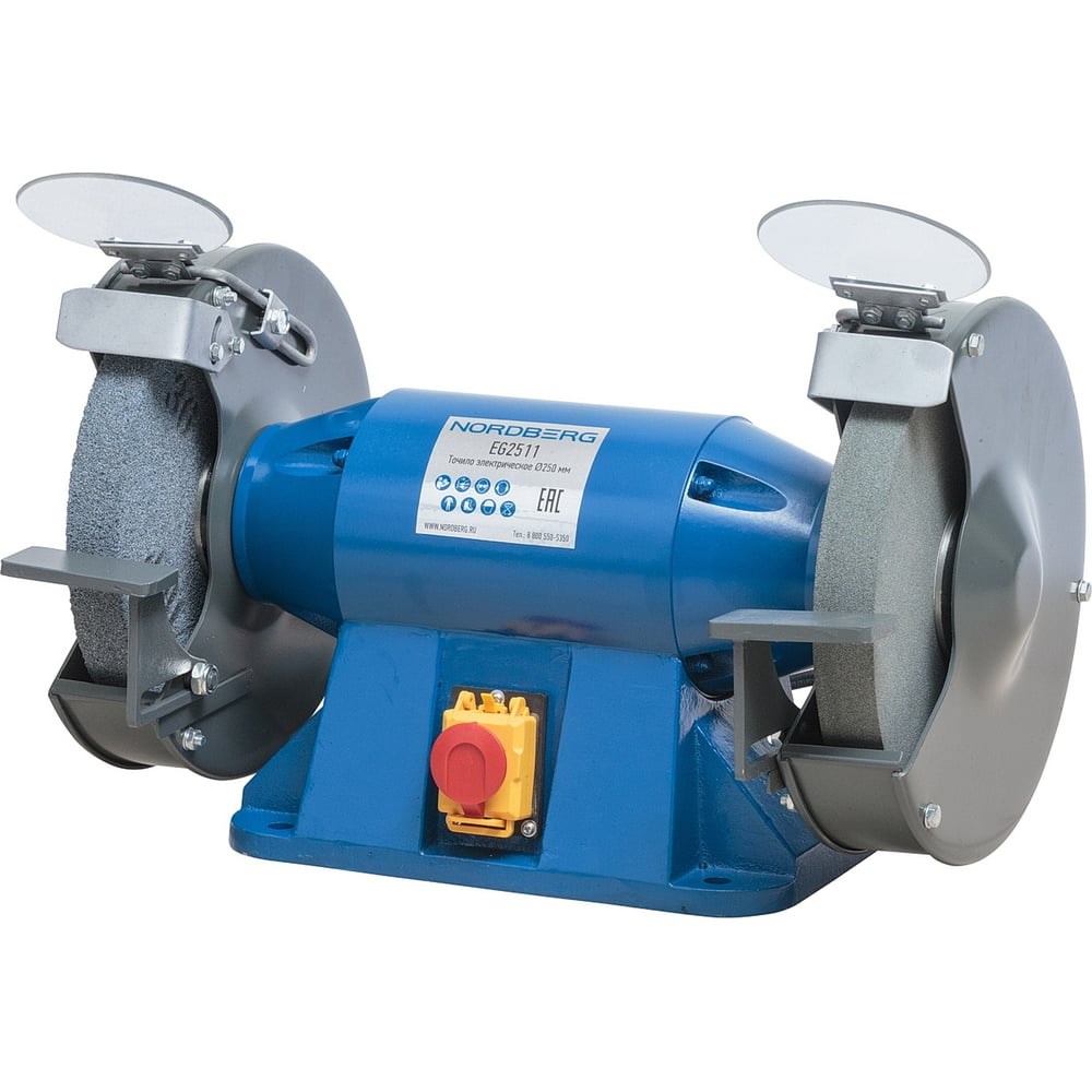 Электрическое профессиональное точило 250мм, 380В NORDBERG EG2511 используется для затачивания, шлифовки и полировки оборудования. Небольшие габариты позволяют установить изделие на верстаке или столе. В комплектацию входят два защитных стекла, которые обеспечивают безопасность оператора от искр и пыли. Специальная пылезащищенная кнопка продлевает срок службы оборудования. Точильные диски закрыты прочным металлическим кожухом на 3/4, что гарантирует безопасность даже при разломе диска.Размер диска — Ø200×32ר32 мм