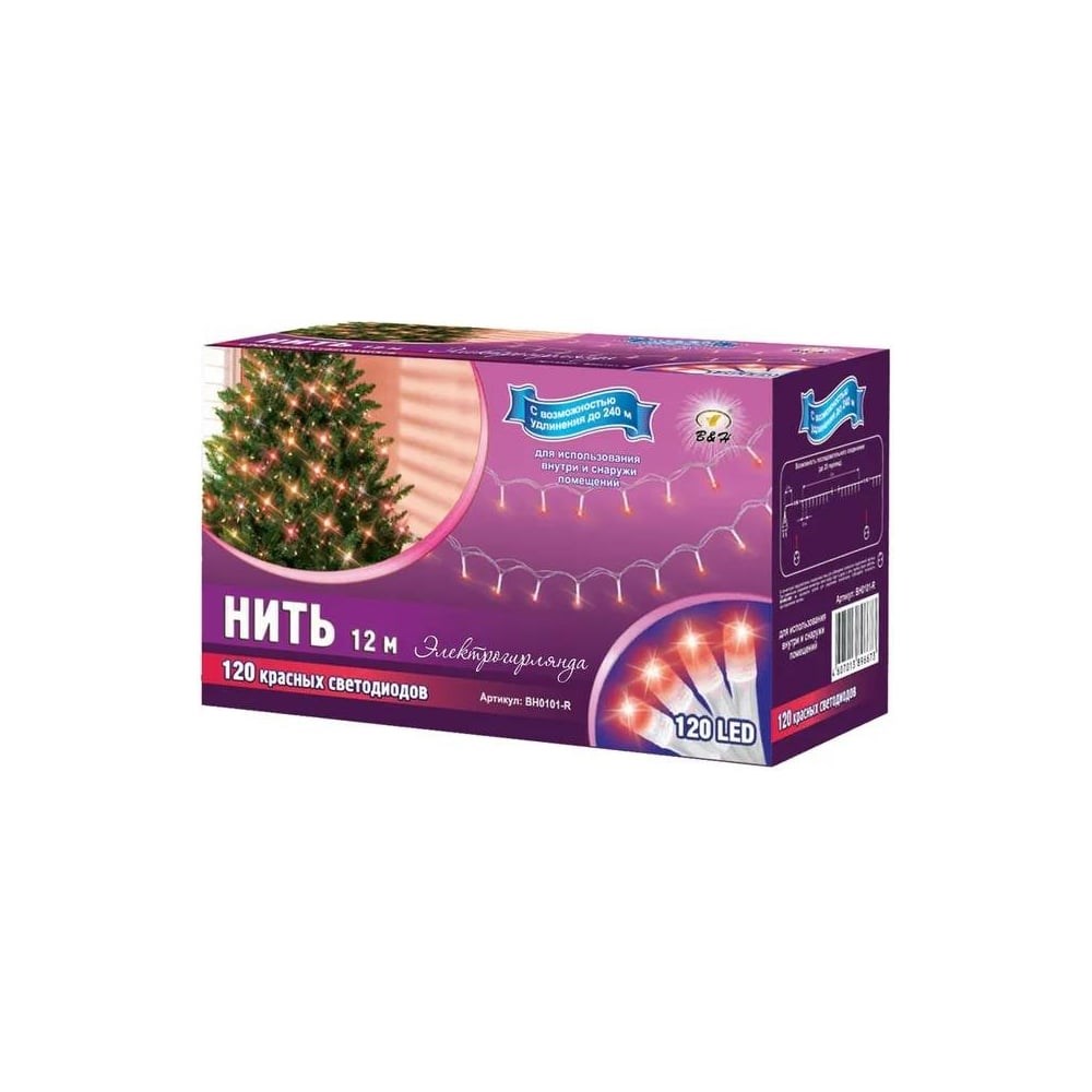 Электрогирлянда B&H Нить 12 м, 120 красных светодиодов BH0101-R - незаменимый атрибут Нового года и Рождества. Светодиодная гирлянда Нить с красным свечением. Она подарит хорошее настроение вам и вашим гостям, наполнит дом и двор атмосферой волшебства. Однотонная и универсальная, впишется в любой интерьер и композицию. Подарите себе праздничный уют всего лишь включив эти чудесные огоньки. Длинная электрогирлянда украсит большую ёлку, шторы и карнизы, стены и фасад, балконные ограждения, беседку или забор. Обязательно порадует вашу семью и гостей внутри дома и снаружи. Используют для оформления витрин и фотозон. Наличие коннекторов-переходников позволяет последовательно соединить до 20 гирлянд. Возможно удлинение до 240 м. Места соединения защищены от влаги. 120 крупных цилиндрической формы led диодов очень яркие, но энергии потребляют в 10 раз меньше, чем обычные лампы. Они расположены на прозрачном проводе длиной 12м. Работает от сети. Сетевой кабель: 1,5 м.
