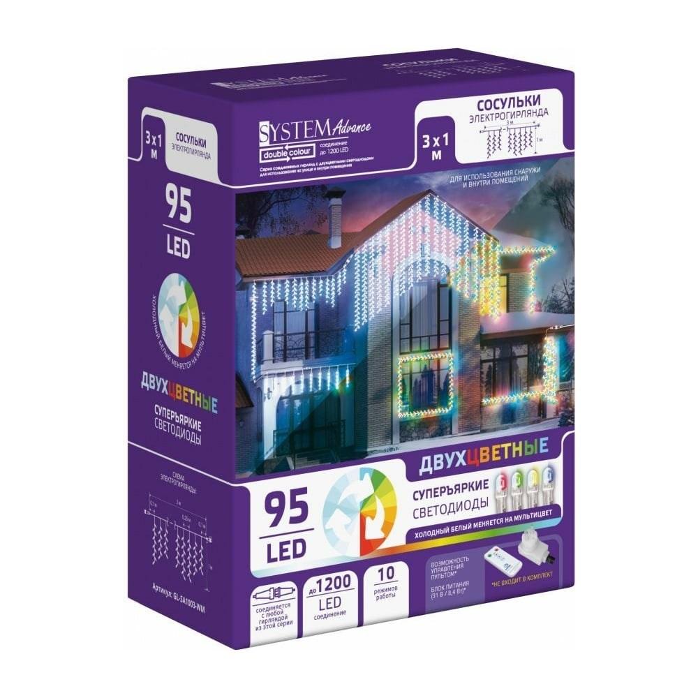 Электрогирлянда GLOS Сосульки, 3x1 м, 95 двухцветных светодиодов (холодный белый + мульти) GL-SA1003-WM серии SYSTEM ADVANCE Double Colour. Украшение для дома и профессиональный уличный декор. Необыкновенно объемное свечение благодаря нестандартному размещению лампочек на проводках. Они направленны в разные стороны, а сама конструкция напоминает бахрому. 95 двухцветных led диодов суперъяркие, потребляют в 10 раз меньше энергии, чем лампы накаливания и не нагреваются. Мульти свечение мягко и плавно сменяется на холодное белое в 10ти разных режимах мигания. Размер: 3х1 м. Нити: 12 штук. Работает от сети. Блок питания и пульт управления НЕ входят в комплект! Их можно приобрести отдельно. Украшения из данной серии соединяются в цепочку до 1200 диодов без потери яркости. Все они работают только от трансформатора 31V. Не боится солнца, снега и дождя, влагостойкость IP44. Диапазон температур от -20С до +30С. Места крепления защищены от влаги. Украшайте двор и сад в любое время года и погоду. Для праздников и повседневной подсветки зданий, сооружений, деревьев и многого другого.