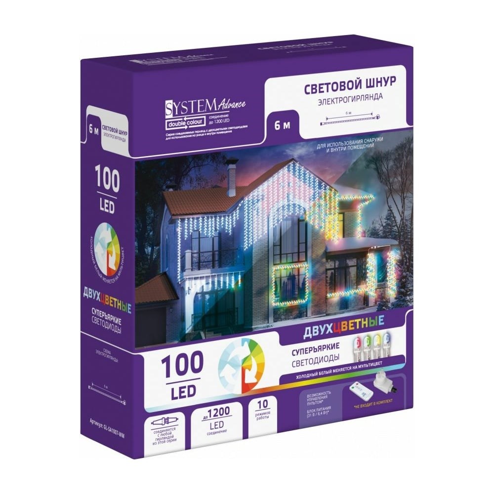 Электрогирлянда GLOS Световой шнур, 6 метров, 100 двухцветных светодиодов (холодный белый + мульти) GL-SA1007-WM предназначена для декоративного наружного и внутреннего освещения. Гирлянда работает только от блока питания 31V и последовательно подключаются между собой с помощью коннекторов. Цепочка может быть удлинена до 1500 LED с помощью блока питания 31V/12W или до 700 LED с помощью блока питания 31V/8,4W. Блок питания в комплект не входит.