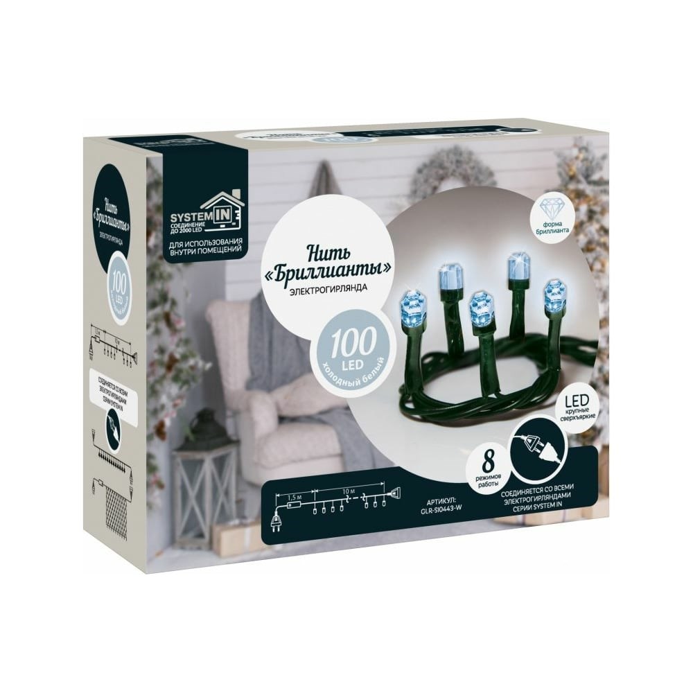 Электрогирлянда GLOS нить "Бриллианты», 10 метров, 100 сверхъярких холодных белых светодиодов GLR-SI0443-W предназначена для декоративного освещения внутри помещений, представляет собой гибкий провод, на котором расположены крупные сверхъяркие холодные белые светодиоды нестандартной формы, напоминающей бриллианты. Гирлянда с 8 режимами работы создаст яркий акцент в Вашем интерьере. Режимы работы гирлянды переключаются контроллером на проводе. Светодиодная электрогирлянда имеет низкое энергопотребление - до 10 раз меньше, чем у электрогирлянд с микролампами и минилампами. Все электрогирлянды серии SYSTEM IN последовательно подключаются между собой с помощью специальных коннекторов. Цепочка электрогирлянд может быть удлинена до 2000 светодиодов, что позволит, используя всего одну розетку, украсить целое помещение.