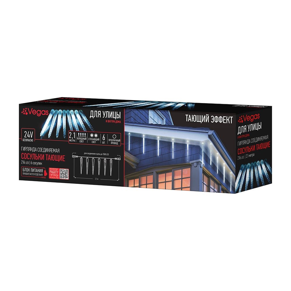 Электрогирлянда-конструктор VEGAS Сосульки тающие, 24V, 6 шт, 216 холодных LED ламп 55111 применяется для создания декоративной и праздничной иллюминации. Предназначена для украшения деревьев, елок, также ею часто украшают фасады и карнизы зданий.Размер гирлянды 210*30 см. Кол-во светодиодов 216. Кол-во сосулек 6. Цвет свечения холодный. Режим свечения стекание. Цвет провода прозрачный. Степень защиты IP44. Температурный режим от -30 до +50, и относительной влажностью 80%. Можно подключить в линию до 4 гирлянд без потери яркости . Блок питания не входит в комплек и преобритается отдельно.Срок службы 25 000 часов