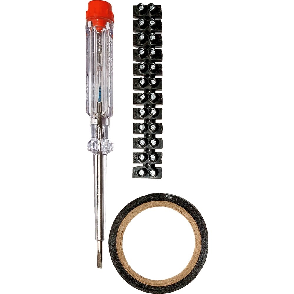 Электромонтажный набор duwi 26000 4 предназначен для определения наличия переменного напряжения, а также для установки светильников и люстр. Индикаторная отвертка - простой и удобный инструмент для выявления нуля и фазы или проверки наличия напряжения в сети. Она комплектуется лампочкой, которая используется в качестве светового индикатора, и резистором для ограничения тока. С помощью клеммной винтовой колодки вы сможете соединить проводники. В набор так же входит изолента предназначенная для обмотки проводов и кабелей с целью их электроизоляции.