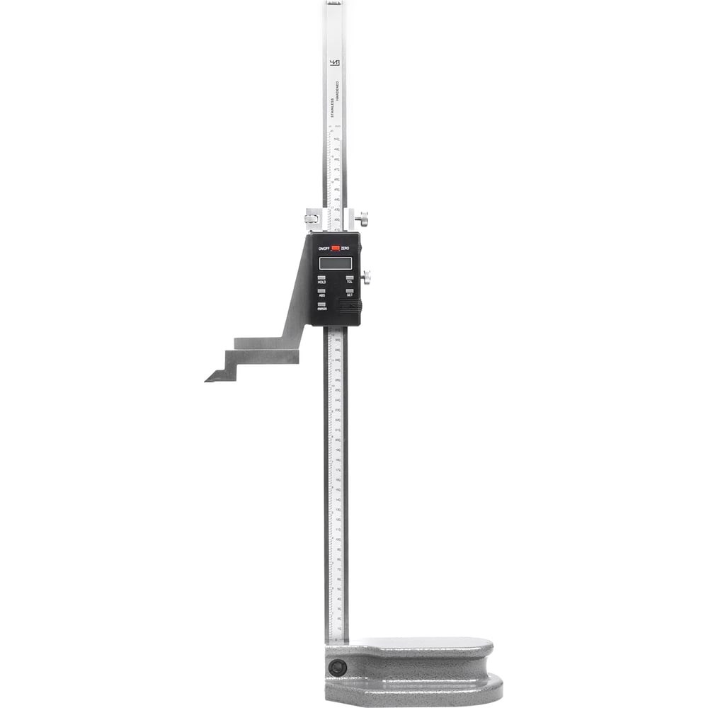 Электронный штангенрейсмас со шкалой ЧИЗ 300 0.01 54545 предназначен для проверки внешних размеров детали. Чаще всего измеряют высоту. Инструмент оснащен тяжелым основанием, которое обеспечивает устойчивость. Для функционирования измерительного блока нужна батарея LR44.