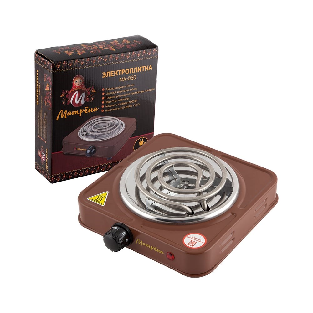 Электроплитка Матрёна МА-060, коричневый, ТЭН 006056 подойдет для приготовления пищи на даче. Имеет небольшие габариты, поэтому не займет много места. Предусмотрен световой индикатор работы. Дополнительные характеристики Плавная регулировка температуры конфорки Защита от перегрева Размер конфорки 140 мм