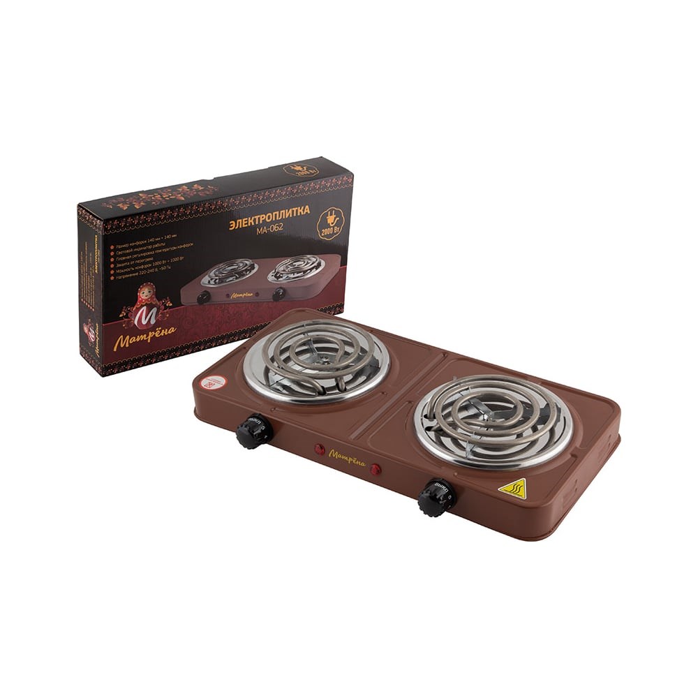 Электроплитка Матрёна МА-062, коричневый, ТЭН, 2 конфорки, подойдет для приготовления полноценного обеда. Незаменима в тех местах, где нет возможности пользоваться бытовым газом. Размер конфорок 140 мм. Световой индикатор работы Плавная регулировка температуры конфорки Защита от перегрева Мощность конфорок 1000 Вт + 1000 Вт