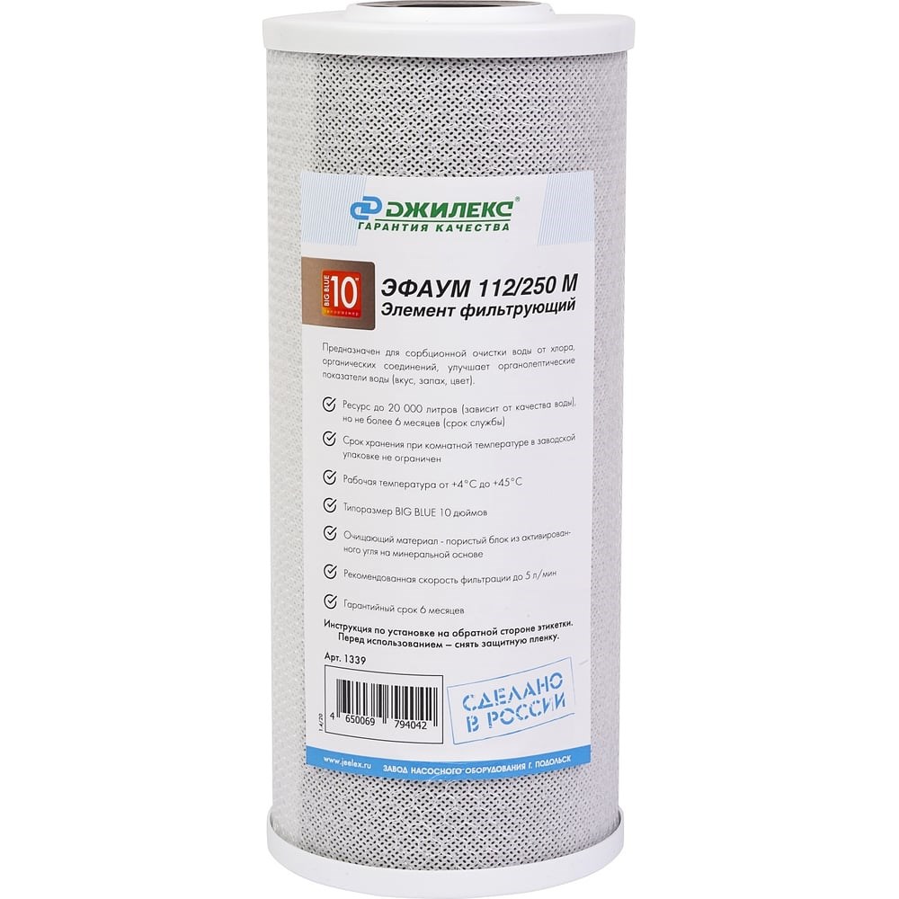 Картридж ДЖИЛЕКС Элемент фильтрующий ЭФАУМ 112/250М 10 ББ 1339 предназначен для сорбционной очистки воды от хлора, органических соединений, улучшает органолептические показатели воды (вкус, запах, цвет). Очищающий материал - пористый блок из активированного угля на минеральной основе.
