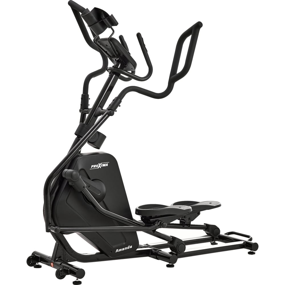 Эллиптический тренажер Proxima Amanda является бюджетной версией переднеприводного эллиптического тренажера с увеличенной длиной шага. Несмотря на его бюджетную стоимость, эллиптический тренажер имеет все необходимые базовые функции для эффективных тренировок. Как упоминалось ранее, тренажер имеет оптимальную длину шага - 50 см, это позволяет комфортно тренироваться с пользователем среднего и выше среднего роста. Максимальная нагрузка на конструкцию составляет 130 кг. Кроме того, расстояние между педалями (Q фактор) составляет 10 см, то есть положение стоп при тренировке приближено к естественному шагу. Также тренажер будет интересен пользователям и с хорошей физической подготовкой, так как обладает 32 уровнями сопротивления, регулируемых с консоли тумблером. Плавный ход обеспечивается подшипниками во всех сочленениях, а также сбалансированностью конструкции тренажера. Также стоит отметить усиленный держатель планшета и бутылки для воды. Держатель расположен на комфортной  высоте и будет удобен для просмотра различных видео файлов. Данный тренажер отличается продуманной конструкцией рукояток, что подойдёт пользователям различной комплекции. Кроме того, меняя положения рук на рукоятках можно равномерно распределить нагрузку на весь плечевой пояс. Консоль имеет LCD дисплей размером 129*61 мм, это позволит отслеживать все показатели тренировки и управлять тренажером без каких-то усилий. Общий размер консоли составляет 270*218 мм. Тренажер оснащен транспортировочными роликами и компенсаторами неровности пола.