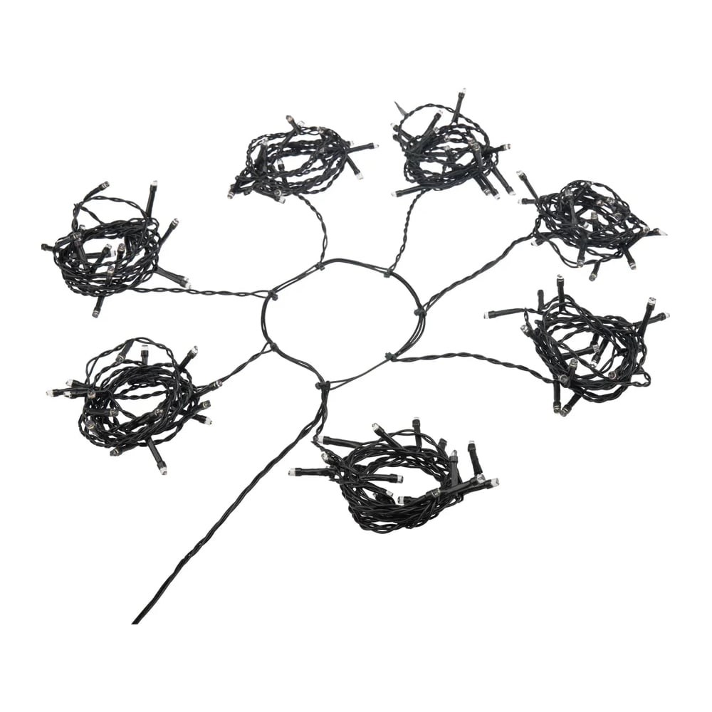 Елочная гирлянда с кольцом и 7 нитями по 1,8 м — это эффектное украшение новогодней ели, которое устанавливается буквально за минуту. Конструкция выполнена в виде кольца, к которому крепятся отдельные отрезки провода со светодиодами. Достаточно поместить кольцо на вершину елки, распределить нити между ветками или оставить их свободно свисать — оригинальный декор готов. 126 светодиодов излучают белый нейтральный свет, имитируя сверкающий иней, и меняют режимы при помощи контроллера. В устройстве управления предусмотрено 8 режимов свечения. Гибкий шнур защищен изоляционной оболочкой из темно-зеленого ПВХ, длина питающего шнура — 3 метра.