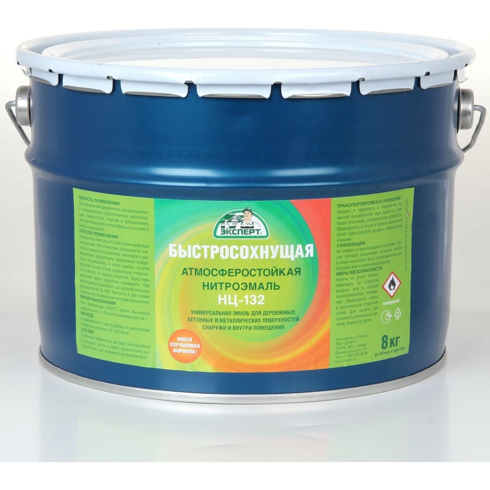 Эмаль ЭКСПЕРТ НЦ-132 черная, 8 кг 22748 применяется для окрашивания деревянных, оштукатуренных и металлических поверхностей, изделий и оборудования снаружи и внутри помещений.Благодаря составу, продукт образует атмосферостойкое, глянцевое покрытие. При температуре воздуха от 18 до 22 градусов время высыхания каждого слоя 1 час.