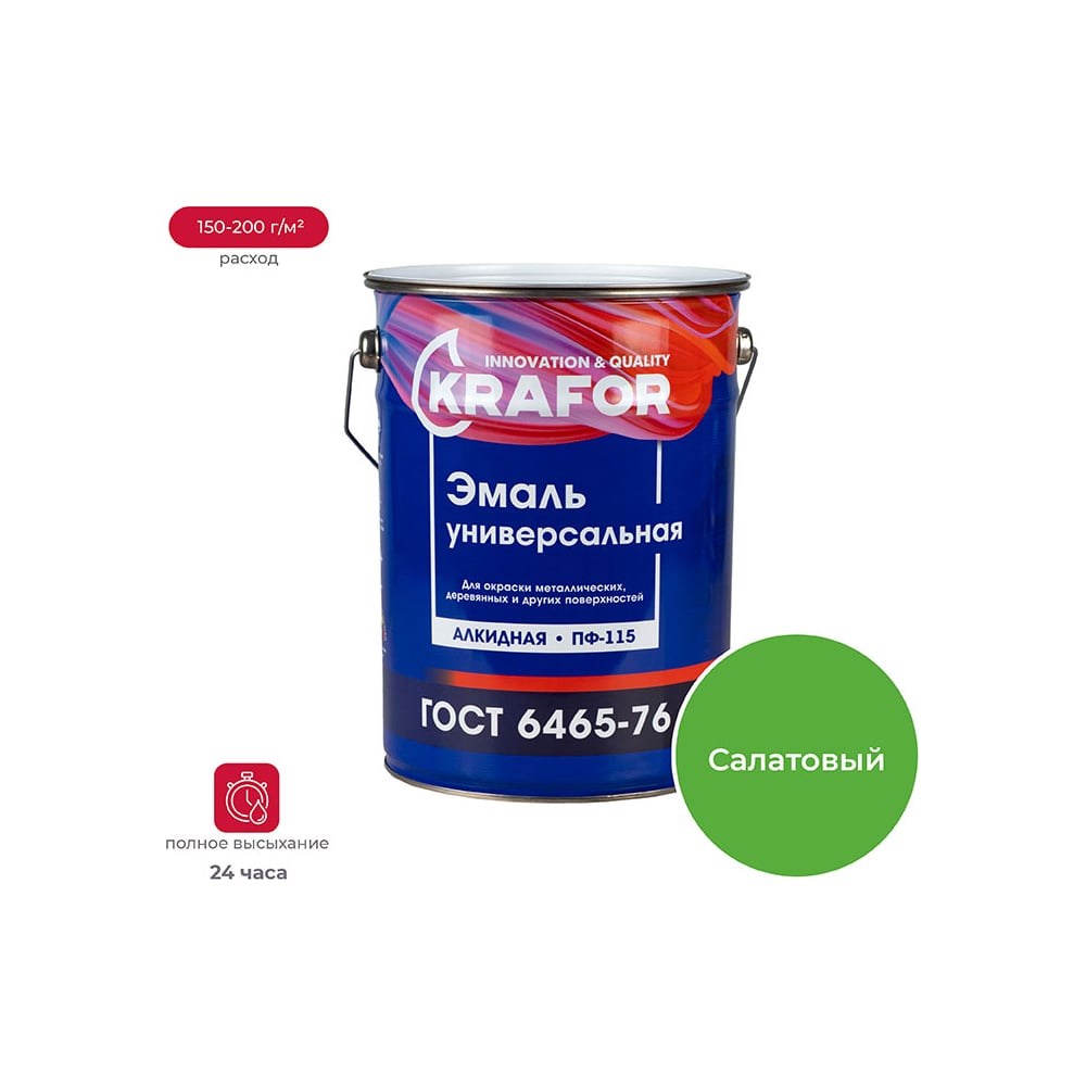 Предназначена для окраски деревянных , металлических и других поверхностей, подвергающихся атмосферным воздействиям, и для окраски внутри помещений (оконные рамы, двери, кирпичные и бетонные поверхности, ДВП, ДСП). Расход: 150-200 г/м², на однослойное покрытие в зависимости от цвета эмали. Высыхание: 24 часа. Срок годности: 547 суток. Салатовый Эмаль ПФ-115 Покрытие отличается высокими защитными и декоративными свойствами, износоустойчивостью. Эмаль на основе алкидного лака. Атмосферостойкая. Обладает адгезией к различным типам поверхности. Устойчива к изменению температуры от -30°С до +30°С. Возможна колеровка универсальными колерами, но не более 10% от объема эмали.