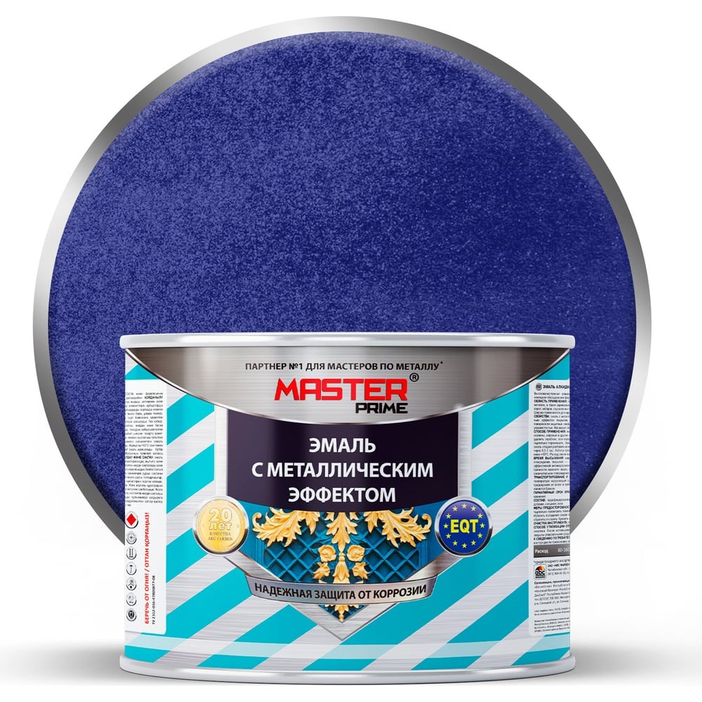 Высококачественная алкидная модифицированная эмаль с металлическим эффектом. Придает поверхности высокие защитные свойства и красивый внешний вид. Образует прочное долговечное покрытие. Обладает отличной адгезией к металлическим поверхностям. Наносится прямо на ржавчину, обладает высокой укрывистостью. Маскирует мелкие дефекты поверхности. Легко наносится, не требует предварительного грунтования, быстро высыхает. Предотвращает появление коррозии.При нанесении эмали по ржавчине важно в точности соблюдать рекомендации по времени межслойной сушки и учитывать, что в промежутке от 2-х часов до 7-ми суток после нанесения первого слоя, наносить последующие слои не допускается- оптимально – нанесение эмали распылителем, причем в несколько проходов, но за один раз, не прерываясь на межслойную сушку- для более эффективной антикоррозионной защиты рекомендуем использовать грунт по ржавчине MASTER PRIME (эмаль наносится поверх грунта ровно через 1 час или по истечении 7 суток, после окончательного отверждения грунта).При нанесении краскопультом эмаль следует разбавить ксилолом или сольвентом на 5-10 % от объема эмали. Второй слой следует наносить через 30-60 минут (но не позднее, чем через 2 часа).Время высыхания каждого слоя при температуре +20°С «от пыли» - 2 часа, второй слой следует наносить через 30-60 минут (но не позднее, чем через 2 часа). Окончательное отверждение покрытия - 5-7 суток в зависимости от влажности и условий отверждения.Расход 80-160 г/м² на однослойное покрытие