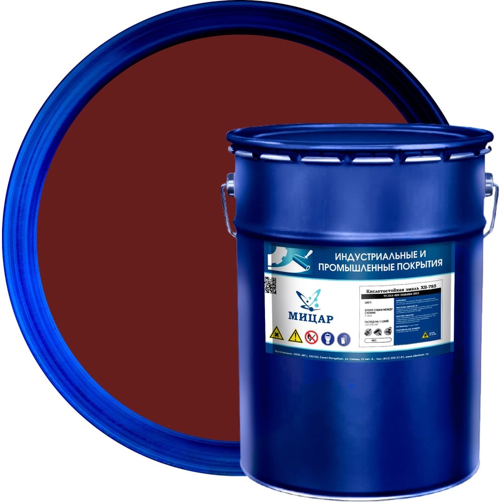 Кислотостойкая эмаль Мицар ХВ-785 20 кг красно-коричневый УТ000005072 применяется для покраски ранее загрунтованных поверхностей, конструкций, сооружений и оборудования из металла, железобетона и бетона. Обеспечивает надежную антикоррозийную защиту от влаги, агрессивных газов, щелочных, кислотных и солевых растворов при температуре не более +60°С. Защитные свойства трехслойного покрытия сохраняются около 6 лет при умеренном климате. После высыхания образуется долговечное глянцевое покрытие.