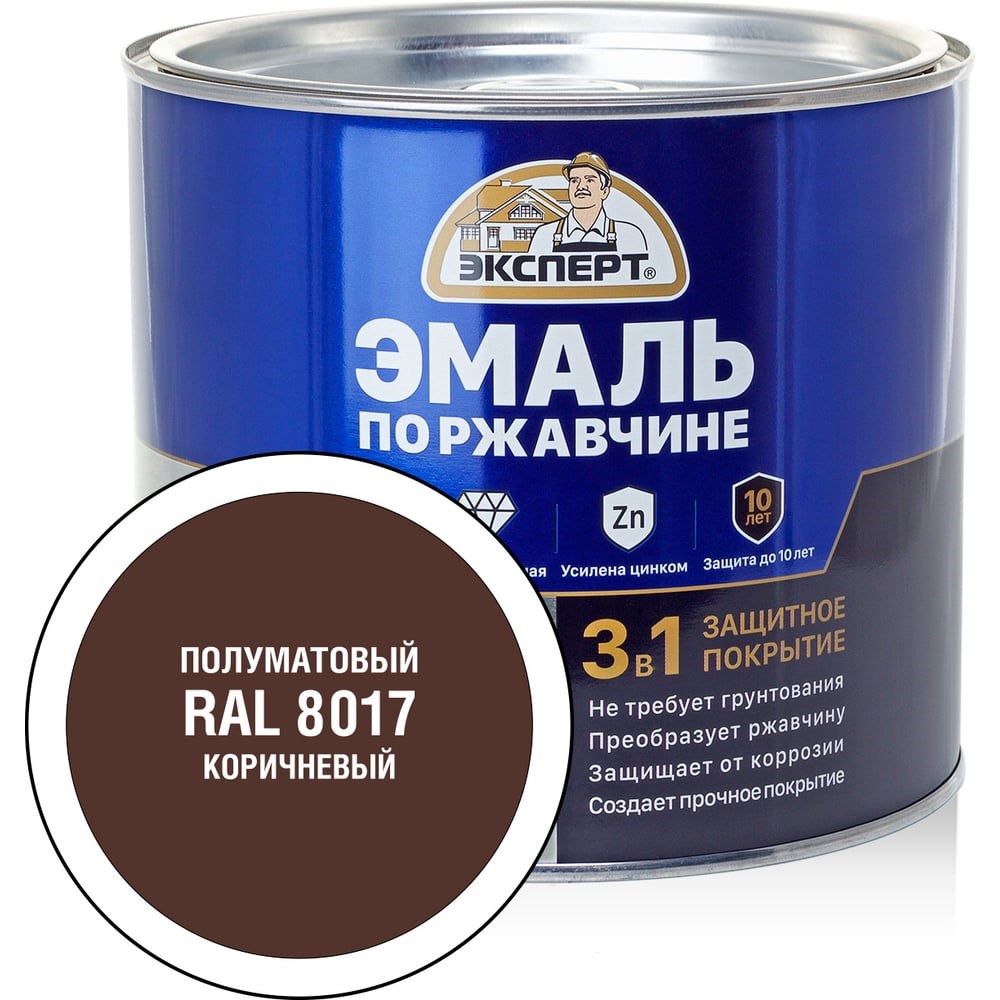Эмаль ЭКСПЕРТ по ржавчине 3 в 1 полуматовая, коричневый RAL 8017, 1.8 кг 28254 применяется для защитно-декоративного окрашивания металлических, деревянных, бетонных и железобетонных конструкций без предварительного грунтования. Состав объединяет свойства 3 продуктов: преобразователя ржавчины, антикоррозионного грунта и декоративной эмали. Используют для внутренних и наружных работ. Способ нанесения: Поверхность предварительно очистить от пыли, рыхлой ржавчины, загрязнений и обезжирить. При окрашивании алюминиевых, оцинкованных или гальванизированных основ предварительно используют грунтовку для цветных металлов. Наносят состав в два слоя кистью, валиком или методом распыления. При температуре 20 градусов и 65 % относительной влажности воздуха эмаль высыхает примерно через 2-4 часа. Повторное нанесение средства допускается через 24 часа. При соблюдении правил нанесения покрытие обеспечивает защиту металла до 10 лет.