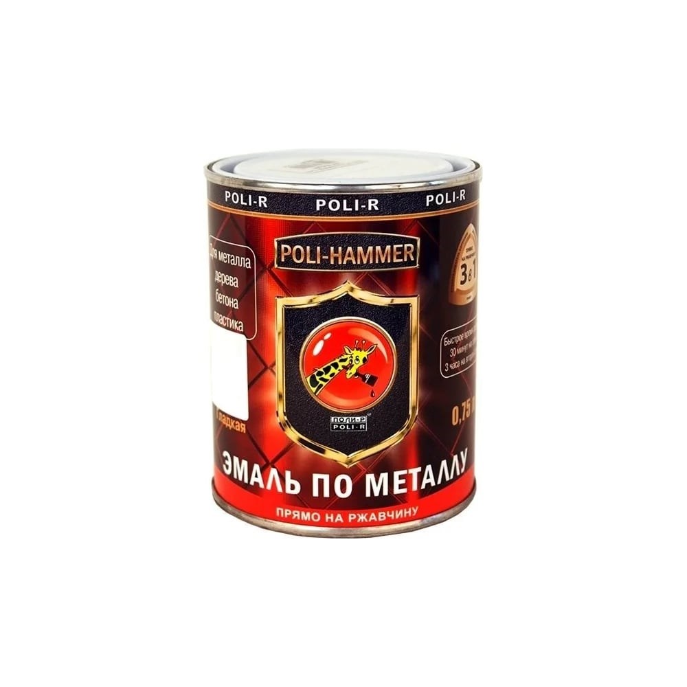 Эмаль по ржавчине Poli-Hammer обеспечивает идеальную защиту от коррозии на длительный срок и создает превосходный декоративный эффект. Применяется для окраски пластиковых, деревянных, кирпичных, бетонных и металлических оснований (изготовленных из черных, цветных и оцинкованных металлов). Образует влагонепроницаемое и устойчивое к атмосферным воздействиям покрытие. Полностью отвердевшая пленка эмали выдерживает температурный диапазон от -45 С до +80 С (кратковременно до + 150 С). Обладает химической стойкостью к растворам кислот/щелочей, бензина, дизельного топлива. Перед применением эмаль по ржавчине необходимо тщательно перемешать. При необходимости разбавить 646 растворителем: не более чем на 15% для нанесения кистью или валиком, не более чем на 35% для нанесения краскопультом. Поверхность должна быть сухой и чистой от жира, пыли, отслоений и остатков прежних покрытий. Осыпающиеся частицы ржавчины нужно удалить щеткой с металлическим ворсом или абразивным средством. Цинковые поверхности должны быть обезжиренные. Не наносить при температуре ниже +5 С и относительной влажности воздуха свыше 70%. Инструмент для нанесения: кисть, валик (не создающий капель), краскопульт. Наносить эмаль по ржавчине рекомендуется в два слоя, перерывом между слоями 3-5 часов. Если Вы не успели нанести второй слой вовремя, то повторно окрашивание следует проводить только через 2 недели. Расход - 1л на 12-15 м2 Растворитель - растворитель 646 Время высыхания на отлип - 30-60 минут Между слоями - 3-5 часов Полное время высыхания - 24 часа Полный набор свойств - 4 недели Полимерная основа - эпоксидная модифицированная смола Вид пленки - гладкая, однородная, без дефектов Массовая доля нелетучих веществ - 55% Прочность при ударе - 50 см Адгезия - 1 балл