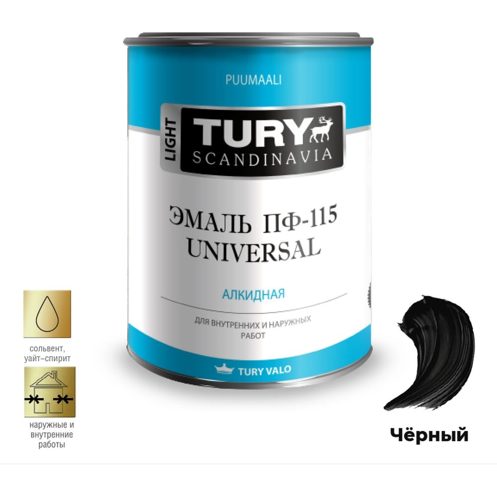 Эмаль TURY Универсал ПФ-115 черная, 0.45 кг 2007244 на основе алкидной смолы для внутренних и наружных работ. Применяется для окраски деревянных, бетонных, кирпичных, оштукатуренных и загрунтованных металлических поверхностей, гипрока, ДСП, ДВП и ОСБ-плит.Благодаря составу, продукт подходит для помещений с повышенной влажностью, а также поверхностей, подверженных длительному атмосферному воздействию. Используют для обработки как новых, так и для ранее окрашенных поверхностей (кроме полов).
