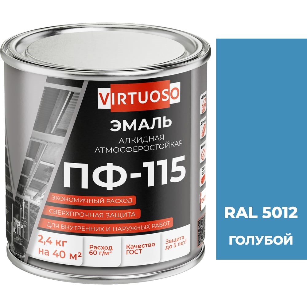 Эмаль VIRTUOSO ПФ-115 ГОСТ голубая 2,4 кг 11588501 высококачественна алкидная эмаль для наружных и внутренних работ, представляет собой суспензию пигментов и наполнителей в пентафталевом лаке с добавлением сиккатива, растворителей и других компонентов.Эмаль применяется для окраски металлических, Деревянных и других поверхностей, подверженных атмосферным воздействиям, а также для малярных работ внутри помещений ( оконные рамы, двери, батареи, ДВП, ДСП и др.)Пленка эмали устойчива к изменению температуры от - 50 до + 60 градусов С. Покрытие, состоящее из двух слоев эмали ПФ115, нанесенных на подготовленную загрунтованную поверхность, в умеренном и холодном климате сохраняет защитные свойства в течении 4 лет, не подвергаясь деструкциям и гарантированно сохраняет свои декоративные свойства в течении 1 года.Покрытие внутри помещений сохраняет свои эксплуатационные и декоративные свойства не менее 5 лет