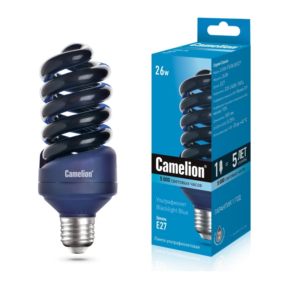 Лампа Camelion со специальным покрытием колбы, дающим длинновол- новое УФ излучение, которое вызывает люминесценцию. Область применения: Медицина Археология, минералогия Криминалистика, банковское дело Спецэффекты в ночных клубах, дискотеках и театрах Пищевая и текстильная промышленность, металлургия Обеспечивает мгновенный старт без мерцания.