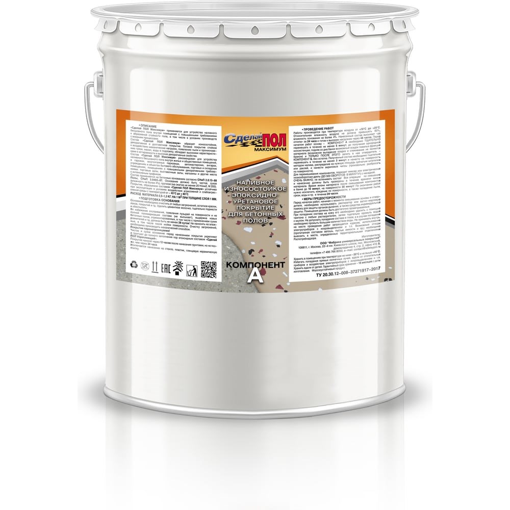 Сделай ПОЛ Максимум - двухкомпонентный, защитный полимерный состав на эпоксидной основе, применяется для устройства наливного бесшовного пола внутри жилых и общественных помещений с повышенными требованиями к абразивной стойкости пола, в том числе в условиях производств с мокрыми процессами. Готовое покрытие стойкое к воздействию механических нагрузок, появлению пыли и проникновению грязи, масел, воды в подложку, а также препятствует образованию грибка и плесени. Рекомендован для устройства наливного бесшовного пола внутри жилых и общественных помещений, на кухнях, санузлах, душевых ,учреждениях и объектах бытового обслуживания, торговых и складских помещениях, помещениях с повышенными декоративными требованиями: торговые залы, выставочные залы, магазины и другие места с интенсивным трафиком. Готовый состав наносится методом налива, с последующим разравниванием раклей, после чего прокатывается игольчатым валиком для устранения пузырьков воздуха на поверхности покрытия. Рекомендованная толщина покрытия 1-3 мм, расход материала составляет 0,9-1 кг на 1 м2 при толщине покрытия 1 мм. Состав применяется на бетонных основаниях согласно СНиП 2.0.13-88 Полы, СНиП 3.0403-87. Основание должно быть чистое, сухое (влажность не более 4%), прочное (на сжатие не менее 20 Н/мм2, М 250). Поверхность не должна иметь значительных уклонов и перепадов, допустимый уклон 4 мм на 2 метра поверхности. Важно, чтобы основание имело отсечную гидроизоляцию, препятствующую капиллярному подсосу воды.