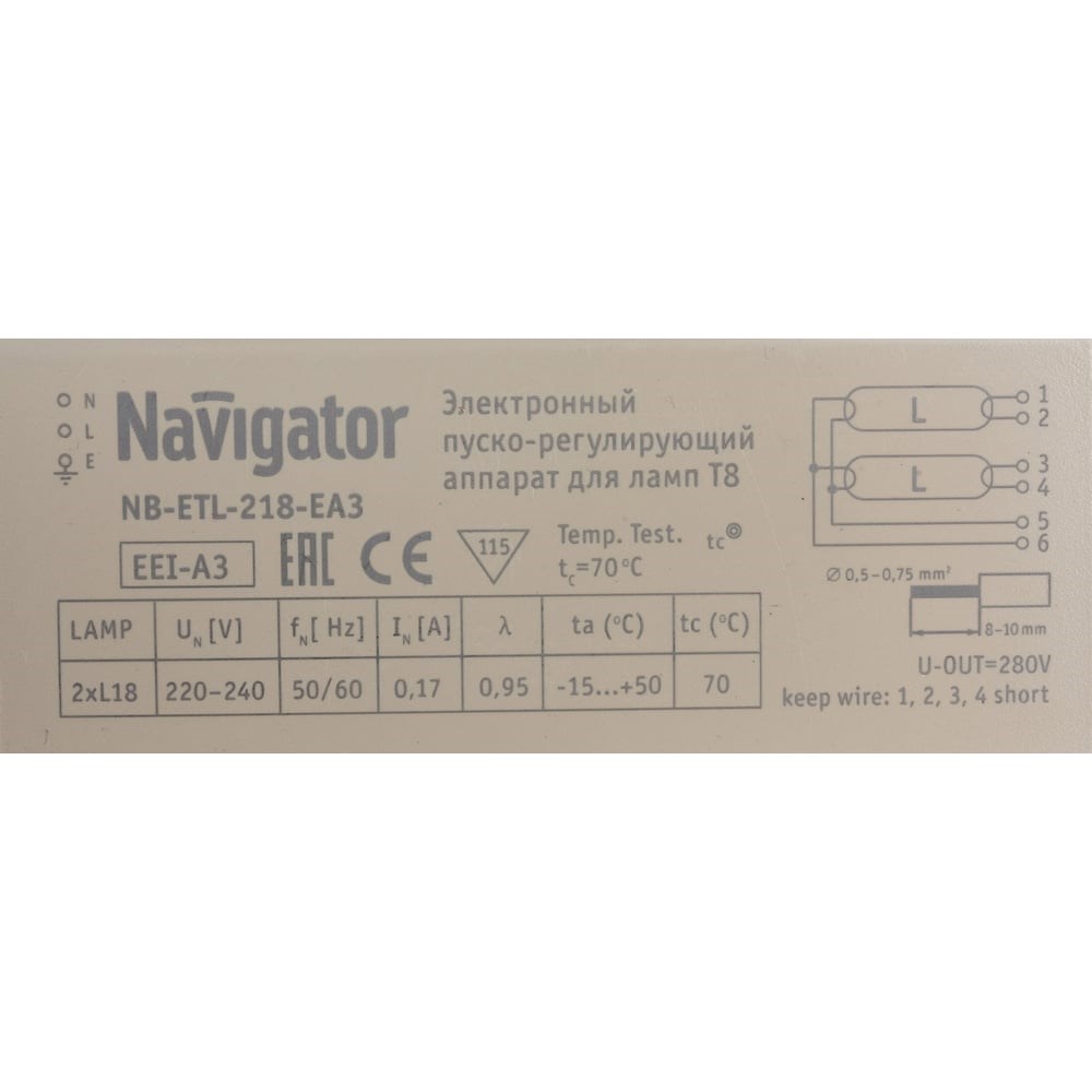 Электронный пускорегулирующий аппарат Navigator ЭПРА 94 426 NB-ETL-218-EA3 94426 представляет собой устройство, которое предназначено для запуска и последующей работы ламп типа PL и типа T8. ЭПРА оснащен защитой от короткого замыкания и перегрева. Функция автоматического отключения срабатывает в том случае, если лампа выходит из строя.