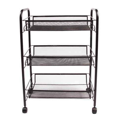 Максимальная нагрузка на каждый из 3 ярусов этажерки - до 5 кг. Изготовлена из прочного металла. Диаметр несущих трубок – 13 мм. Выполнена в черном цвете, который будет гармонировать с большинством офисных и домашних интерьеров. Этажерка оснащена самоориентирующимися колёсами, позволяющими с легкостью перемещать её во время уборки, не повреждая напольное покрытие. Размеры модели - 43,5х26х62,5 см. Вес - 2,2 кг. Собирается без использования крепежа.