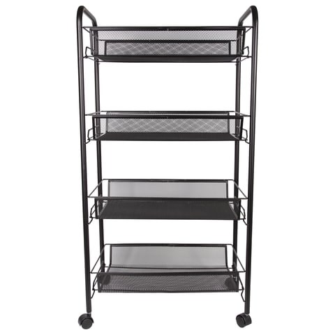Максимальная нагрузка на каждый из 4 ярусов этажерки - до 5 кг. Изготовлена из прочного металла. Диаметр несущих трубок – 13 мм. Выполнена в черном цвете, который будет гармонировать с большинством офисных и домашних интерьеров. Этажерка оснащена самоориентирующимися колёсами, позволяющими с легкостью перемещать её во время уборки, не повреждая напольное покрытие. Размеры модели - 43,5х26х83,5 см. Вес - 3 кг. Собирается без использования крепежа.