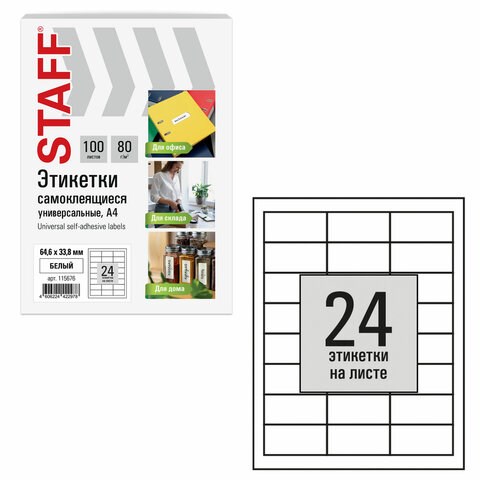 Этикетка самоклеящаяся 64,6х33,8 мм, 24 этикетки, белая, 80 г/м2, 100 листов, STAFF BASIC, 115676