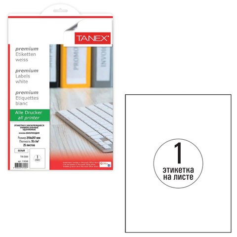 Этикетка самоклеящаяся УДАЛЯЕМАЯ 210х297 мм, 1 этикетка, белая, 70 г/м2, 25 листов, TANEX, сырье Финляндия, 114546, TW-2000