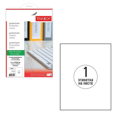 Этикетка самоклеящаяся ВСЕПОГОДНАЯ 210х297 мм, 1 этикетка, полиэстер, белая, 25 листов, TANEX, сырье Финляндия, 114545, TW-2000