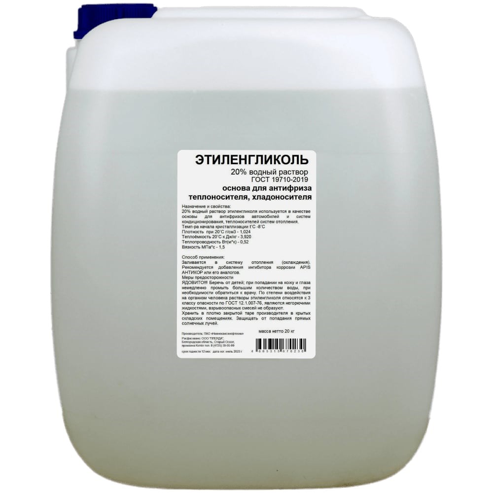 Водные растворы этиленгликоля широко применяются в автономных системах отопления, охлаждения, вентиляции и промышленного кондиционирования в качестве теплохладоносителя. ГОСТ 19710-2019. Температура начала кристаллизации — -8˚С Плотность при 20˚С — 1,024 г/см3 Теплоёмкость 20˚С — 3,920 кДж/кг Теплопроводность — 0,52 Втм*к Вязкость — 1,5 МПа*с
