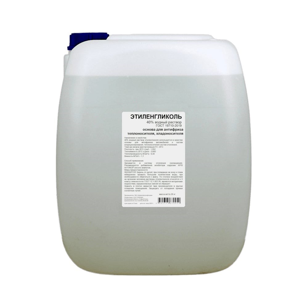 Водные растворы этиленгликоля широко применяются в автономных системах отопления, охлаждения, вентиляции и промышленного кондиционирования в качестве теплохладоносителя. ГОСТ 19710-2019. Температура начала кристаллизации — -24 ˚С Плотность при 20˚С — 1,052 г/см3 Теплоёмкость 20˚С — 3,600 кДж/кг Теплопроводность — 0,44 Втм*к Вязкость — 1,1 МПа*с