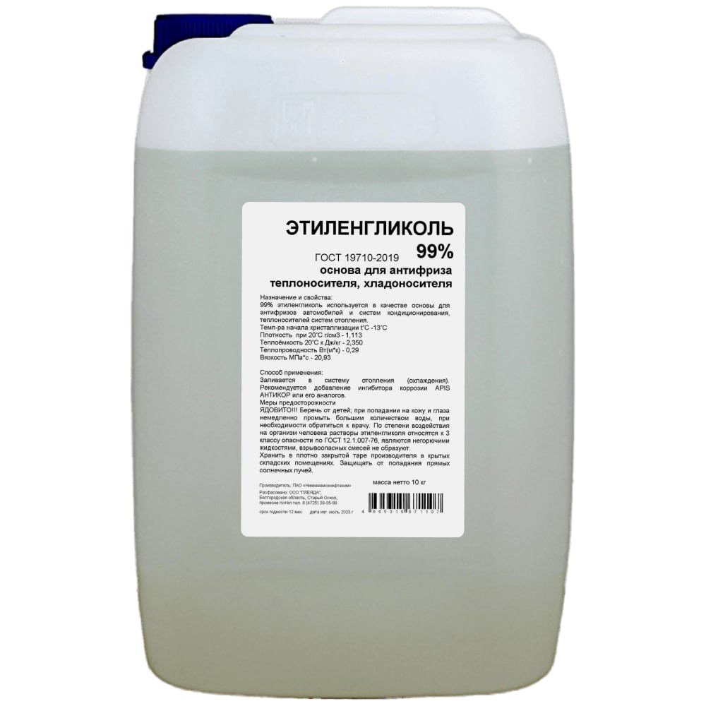 Водные растворы этиленгликоля широко применяются в автономных системах отопления, охлаждения, вентиляции и промышленного кондиционирования в качестве теплохладоносителя. ГОСТ 19710-2019. Температура начала кристаллизации — -13˚С Плотность при 20˚С — 1,113 г/см3 Теплоёмкость 20˚С — 2,350 кДж/кг Теплопроводность — 0,29 Втм*к Вязкость — 20,93 МПа*с