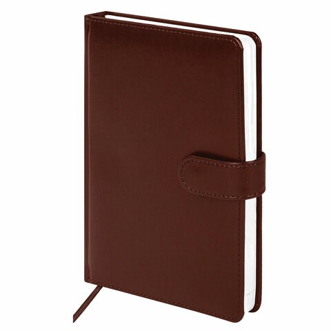 Внутренний блок включает 160 листов белой бумаги плотностью 70 г/м2. Каждая страничка имеет перфорированный угол. Твердая обложка, прошитая по периметру и стилизованная под гладкую кожу фиксируется магнитной застежкой, поэтому ежедневник не откроется в сумке или портфеле и страницы не помнутся.
