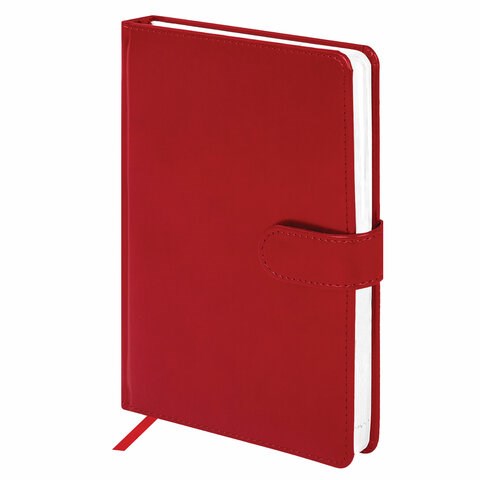 Внутренний блок включает 160 листов белой бумаги плотностью 70 г/м2. Каждая страничка имеет перфорированный угол. Твердая обложка, прошитая по периметру и стилизованная под гладкую кожу фиксируется магнитной застежкой, поэтому ежедневник не откроется в сумке или портфеле и страницы не помнутся.